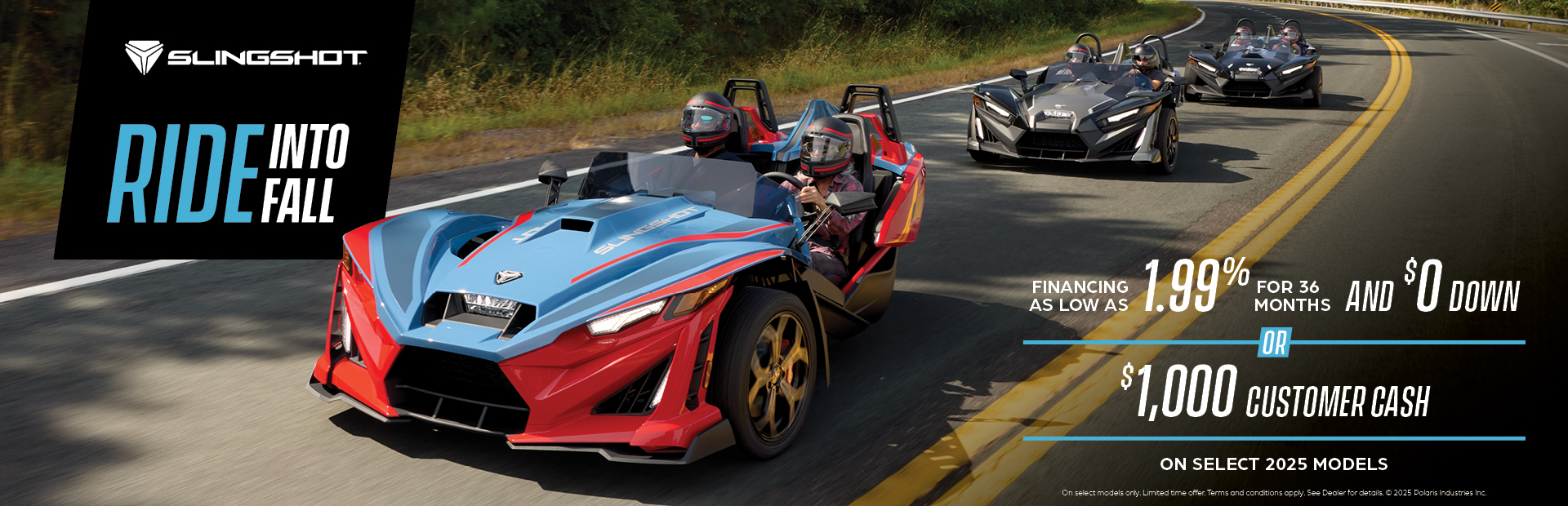 **2025 Model Year Slingshot Family (excluding S, S-Tech and Slingshot 10) 1.99% APR for 36 Months and $0 Down