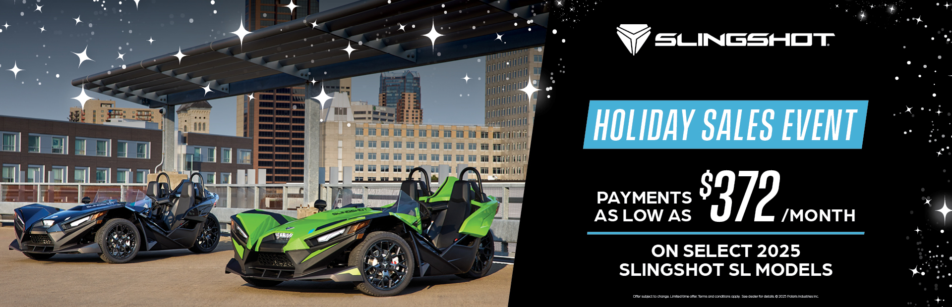 ***2025 Model Year Slingshot Family (excluding S and Slingshot 10) 5.99% APR for 84 Months and $0 Down This is a limited time offer which is valid for the purchase of selected qualifying models and is subject to credit approval on qualified purchases financed during this program. Offer may not be combined with certain other offers, is subject to change and may be extended or terminated without further notice. Offer valid on new 2025 Slingshot® models (excluding S and Slingshot 10). Monthly payment and cost of borrowing will vary depending on amount borrowed and down payment/trade. Minimum amount to finance is $5,000. Example: $28,299 financed at 5.99% APR over 84 months = 84 monthly payments of $372; financed amount of $25,469 with $2,830 down payment, total cost of borrowing of $5,774 and a total obligation of $31,243. An example of monthly payments required on an 84-month term at 5.99% APR is $14.60 per $1,000 financed. Monthly payment examples assume 10% down and do not include taxes, title, and other fees. Offer only valid to qualified customers, not all customers will qualify, other offers available, see dealer for details. Offer Valid: November 1 – 30, 2025. "