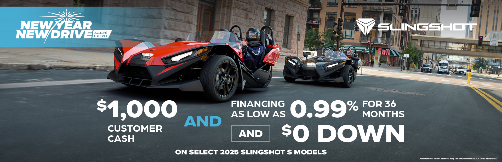 This is a limited time offer which consists of $1,000 Customer Cash rebate towards the purchase of new model year 2025 Slingshot. This offer is subject to change and may be extended or terminated without further notice. Offer may be combined with promotional financing. All rebates paid to dealer and are not redeemable for cash. The $1,000 customer cash offer is specific to the 2025 Slingshot S model. Offer Valid: January 1 – 31, 2026.